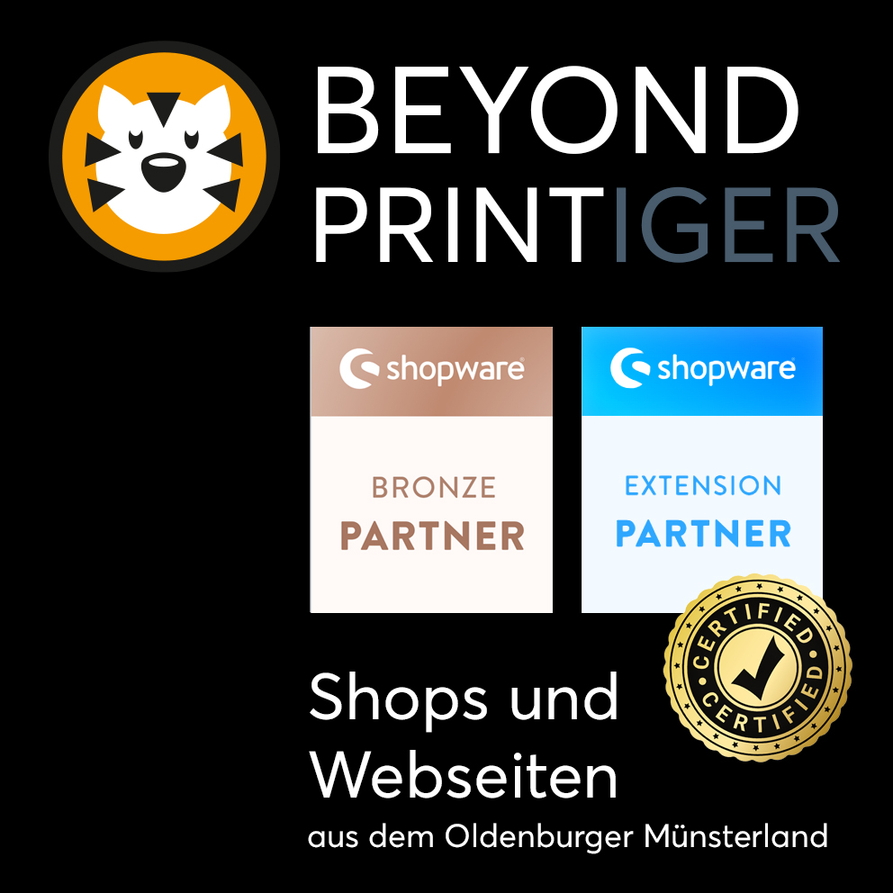 Beyond Print: Die Printiger GmbH ist erneut als Shopware-Partner zertifiziert und ist damit der Ansprechpartner für Shopysteme und Webseiten im Oldenburger Münsterland. Print und Digital sind für uns keine Gegensätze, denn den Wandel vom Bleibuchstaben über den Rasterpunkt bis zum Pixel im Internet leben wir seit 45 Jahren erfolgreich – natürlich an der Gutenbergstraße. Danke an Chef-Programmierer Tobias für die schnelle Umsetzung!